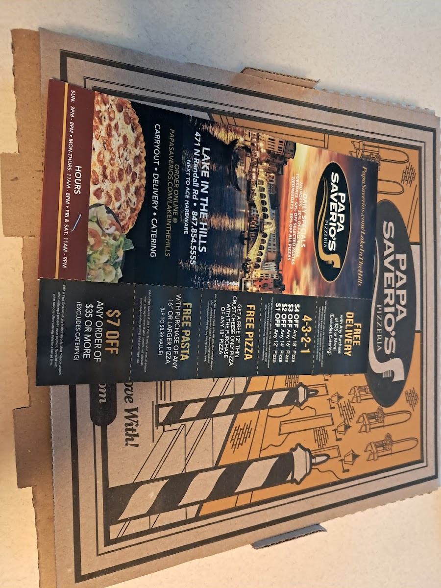 Papa Saverio's menu offers a diverse selection of comfort food with a focus on Italian-American classics. The pizza menu features options like the Saverio's Empire in 10" small, 12" medium, and 14" large sizes, and the flavorful Aglio E Olio in a 16" X-large size. For pasta lovers, the Cheese Ravioli, Baked Lasagna, and Chicken Saverio stand out, while families can enjoy hearty dishes like Family Baked Lasagna and Family Spaghetti. The specialty dinners include options like the 8 Piece Fried Chicken Dinner and the Full Pound Shrimp Dinner. If you're craving a lighter meal, their salads such as the Chicken Caesar Salad and Grilled Chicken Salad are refreshing choices. For a casual bite, the sandwiches like the Italian Beef and Grilled Chicken Sandwich are sure to satisfy, while the appetizers like Breaded Mushrooms and Mozzarella Sticks are perfect for sharing. Don't forget to save room for dessert with options like Oreo Cheesecake or Tiramisu. Wash it down with a 6 Pack Mountain Dew or a 20oz Grape Crush from the beverage selection. Whether you're in the mood for pizza, pasta, or a classic burger, Papa Saverio's offers something for everyone.